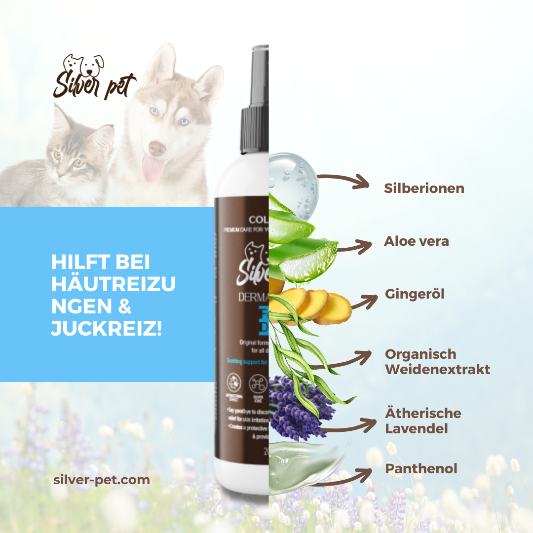 Our Derma-Serum was specially developed for sensitive dog skin and combines the natural power of colloidal silver with nourishing ingredients such as aloe vera, panthenol, allantoin, organic willow extract, and essential oils from ginger and lavender.