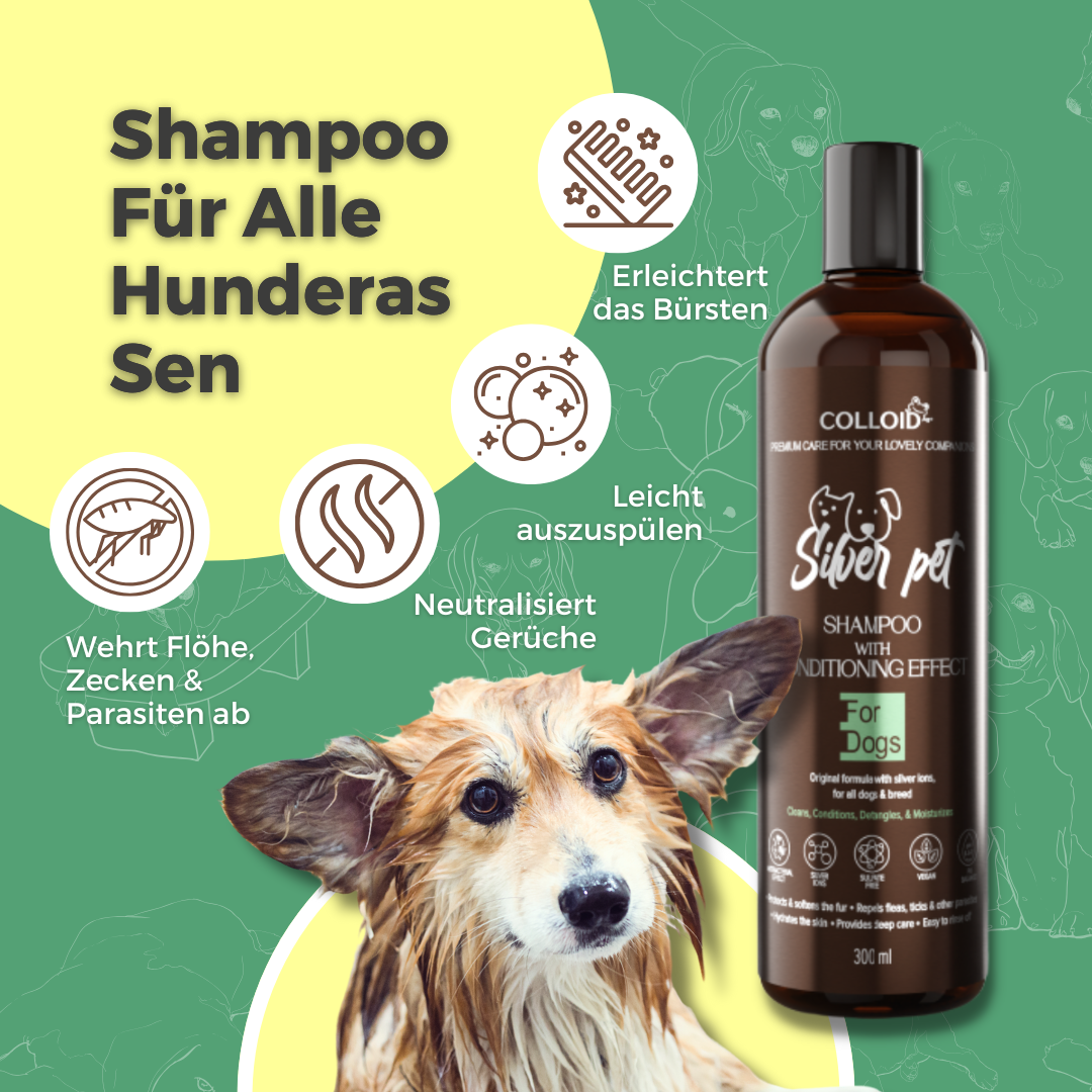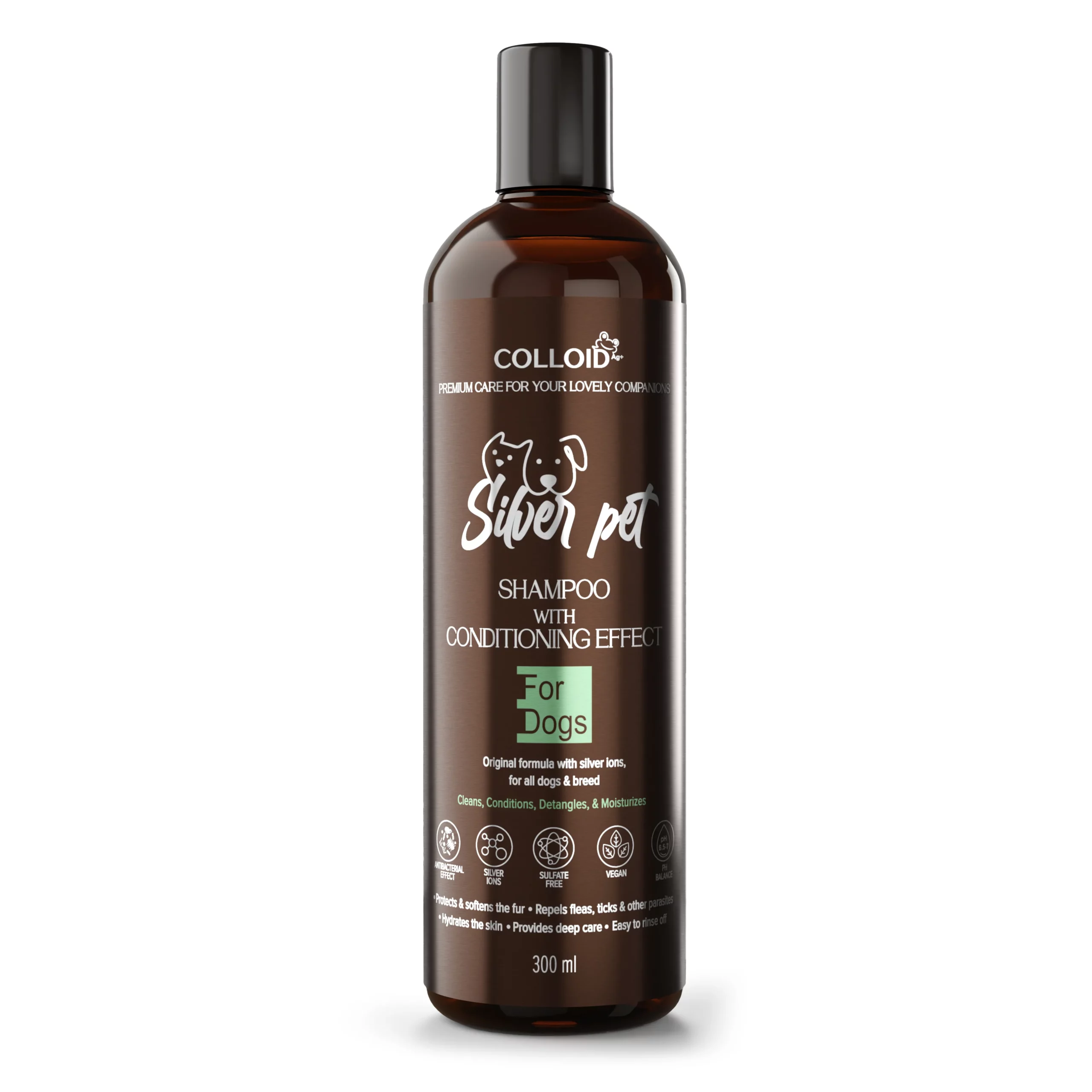 Silver pet shampoo with conditioning effect is an innovative formula with silver ions, hyaluronic acid, avocado, almond, hemp, lavender and immortelle oils, sulfate-free, intended for cleaning, conditioning and detangling dogs’ hair. Makes hair clean, silky and smooth. Silver ions and silver nanoparticles eliminate pathogenic microorganisms that accumulate on the hair and skin of dogs, cleaning them of microbes, thus allowing other active ingredients to manifest their potent effectiveness in a completely clean environment.
