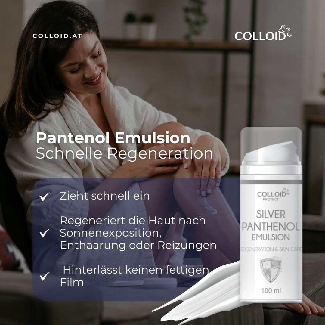 Die Silber Panthenol Emulsion von COLLOID kombiniert 15 ppm kolloidales Silber mit feuchtigkeitsspendendem Panthenol, Aloe Vera, Jojobaöl und Allantoin – für eine wirksame Regeneration empfindlicher, gereizter oder sonnengeschädigter Haut.